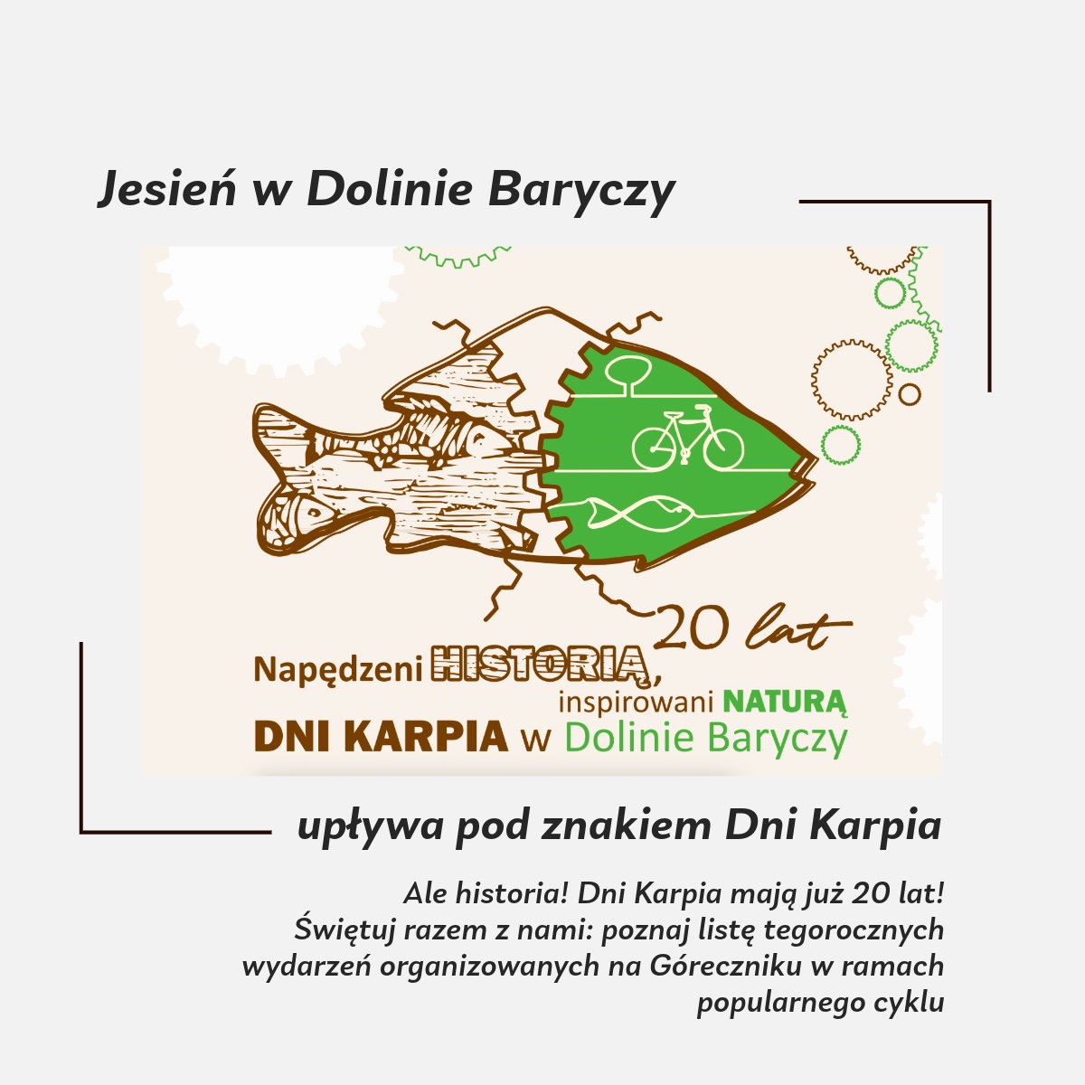 Długi sierpniowy weekend zawsze przypomina nam o zbliżającej się jesieni, ale w Dolinie Baryczy jest to pora roku, w której dużo się dzieje. Nasz region kusi od września do listopada niezwykłymi wydarzeniami w ramach cyklu Dni Karpia w Dolinie Baryczy, który przedłuża sezon turystyczny, stanowiąc jednocześnie jedną wielką zachętę do odwiedzenia 7 gmin na terenie Doliny Baryczy. W tym roku Dni Karpia świętujemy już po raz dwudziesty!