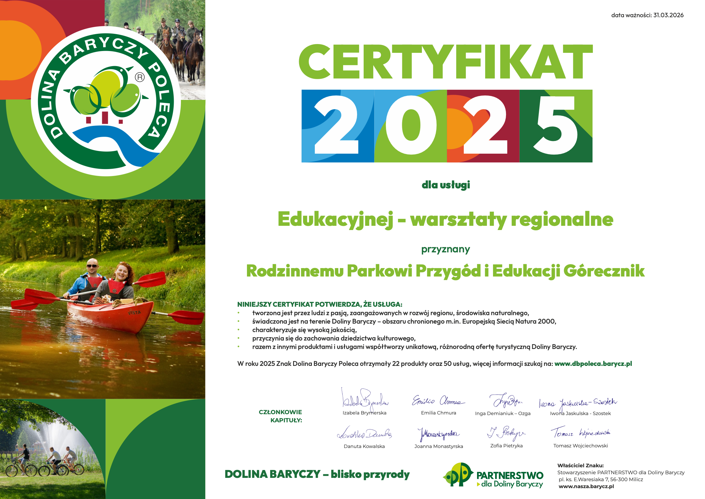 Oferta edukacyjna Rodzinnego Parku Przygód i Edukacji Górecznik od lat szczyci się certyfikatem Dolina Baryczy Poleca potwierdzającym wysoką jakość oferowanych usług i produktów.